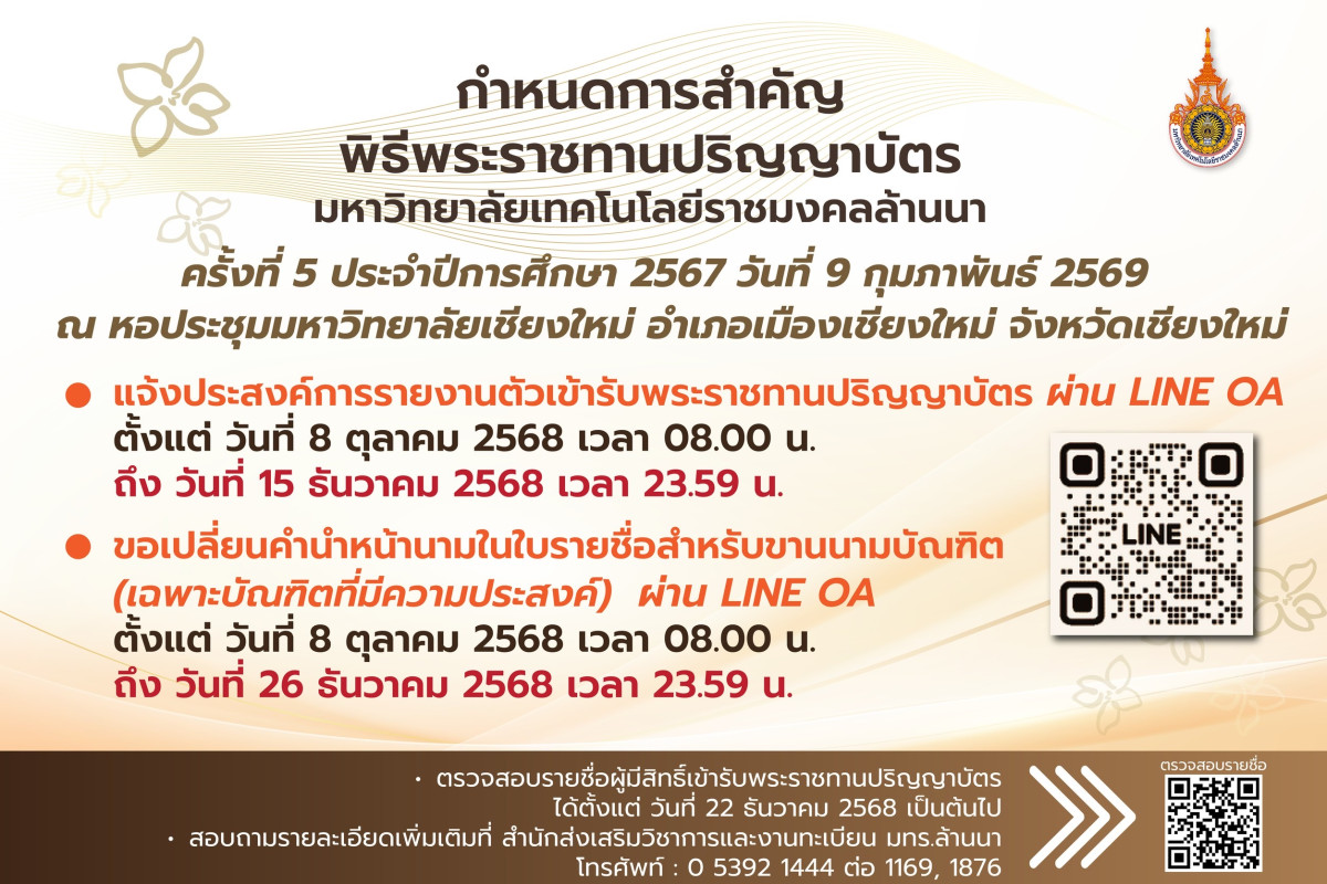 มหาวิทยาลัยเทคโนโลยีราชมงคลล้านนาขอแจ้ง กำหนดจัดพิธีพระราชทานปริญญาบัตร ครั้งที่ 5 ประจำปีการศึกษา 2567